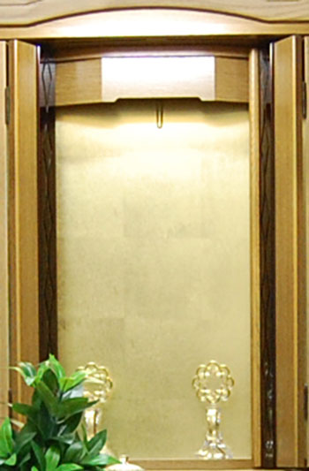 中古仏壇322です。オーク柔らかな木目とこげ茶のエンブレムが落ち着いた雰囲気を醸し出しています。和室や洋室に、拠点にも最適な仏壇です。コンパクトでシンプル、すっきりと毎朝の勤行ができることでしょう!
