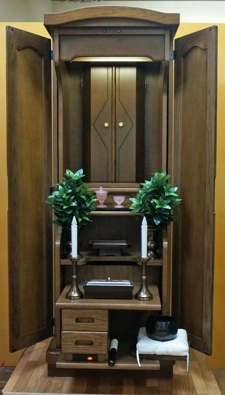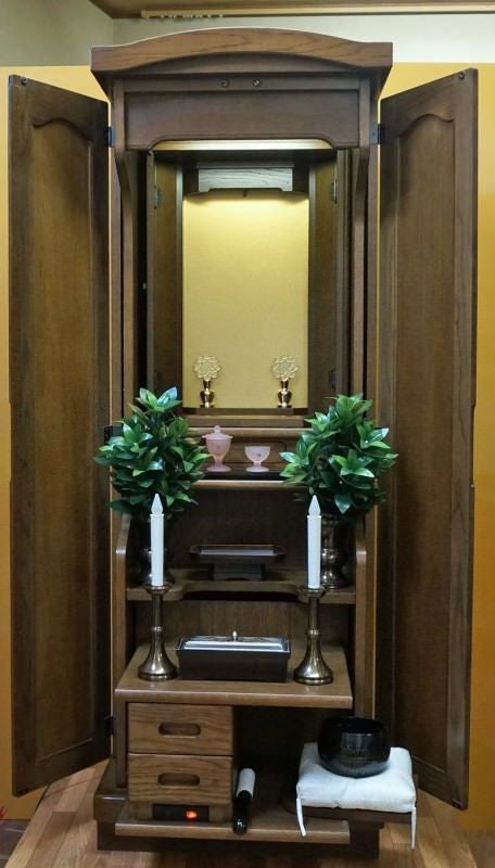 中古仏壇325です。木目が落ち着いた雰囲気を醸し出しています。和室や洋室に最適な仏壇です