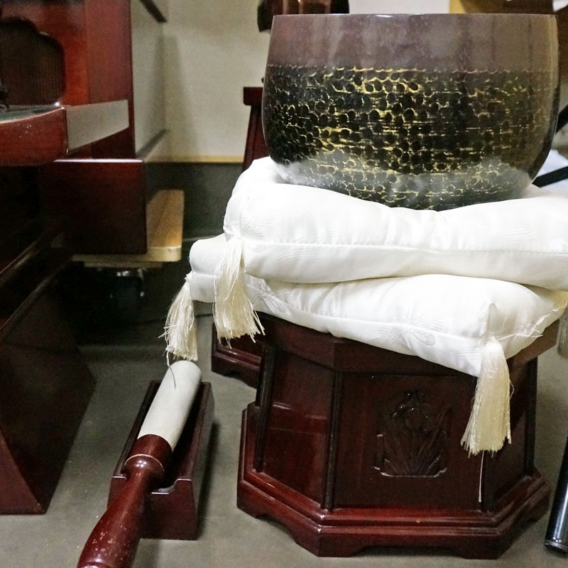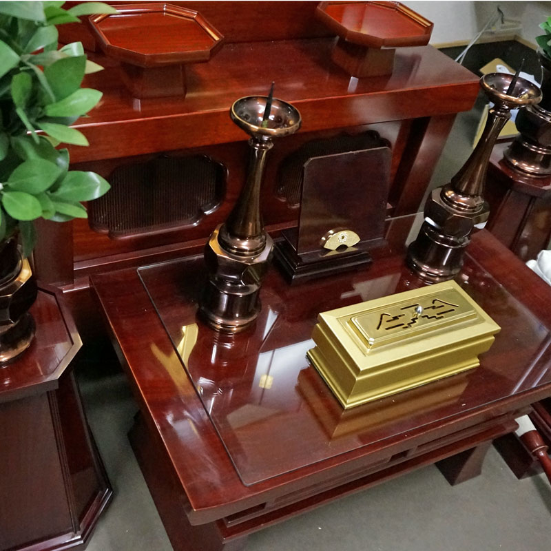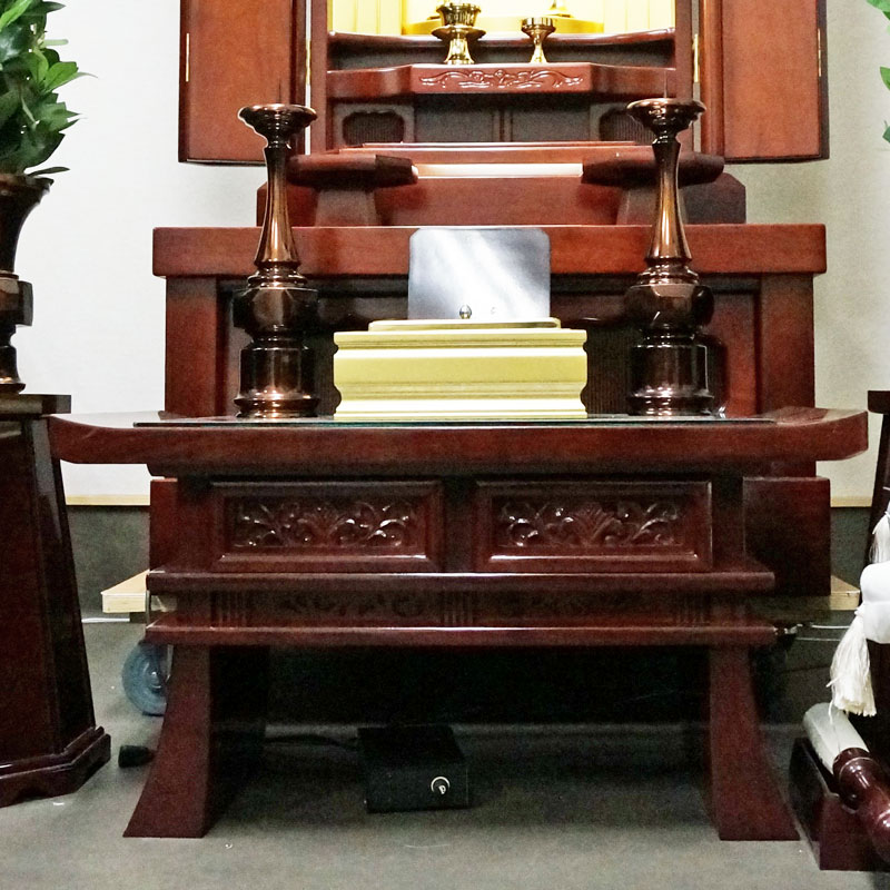 仏壇にふさわしいサイズの経机、花台、大きなおリンもセットされています
