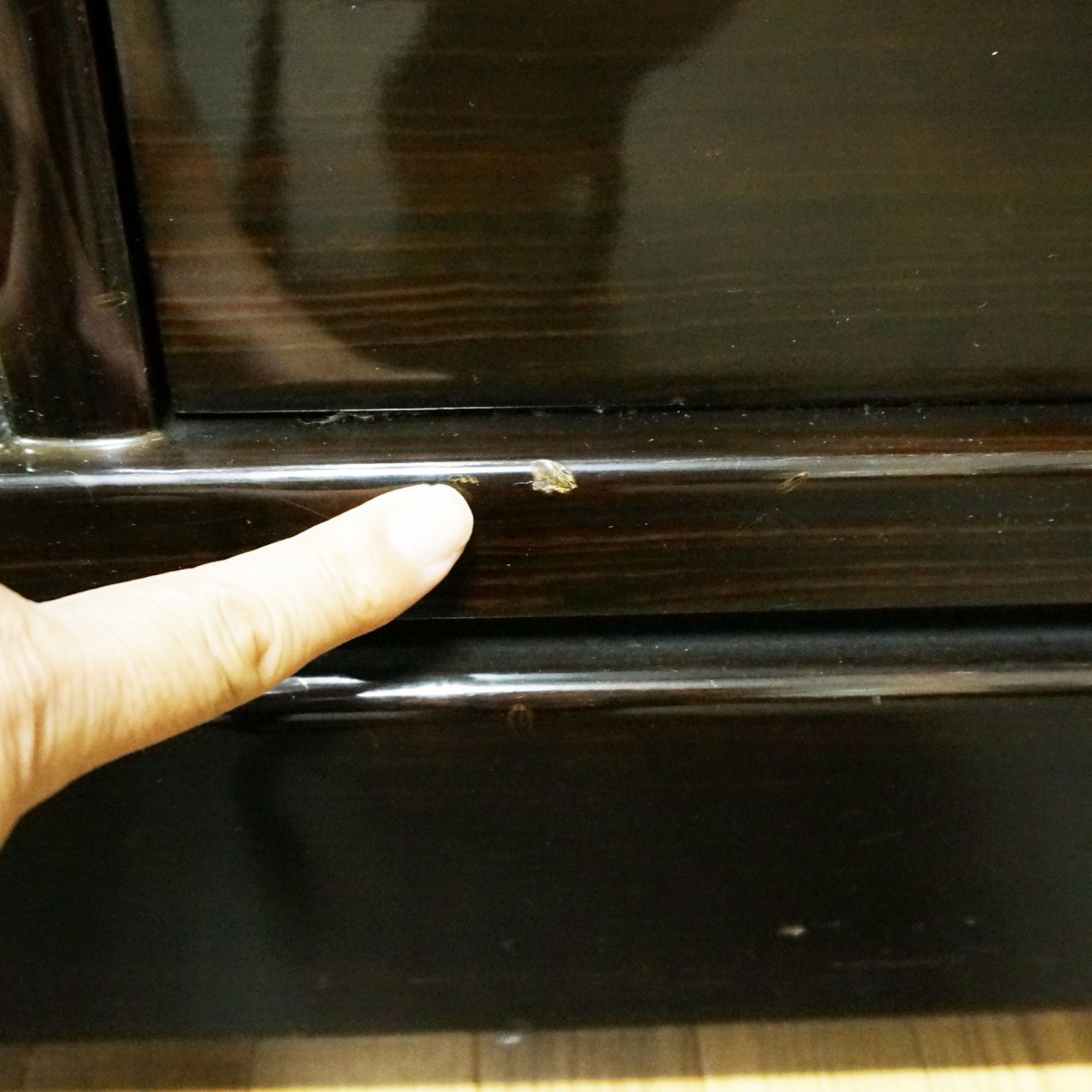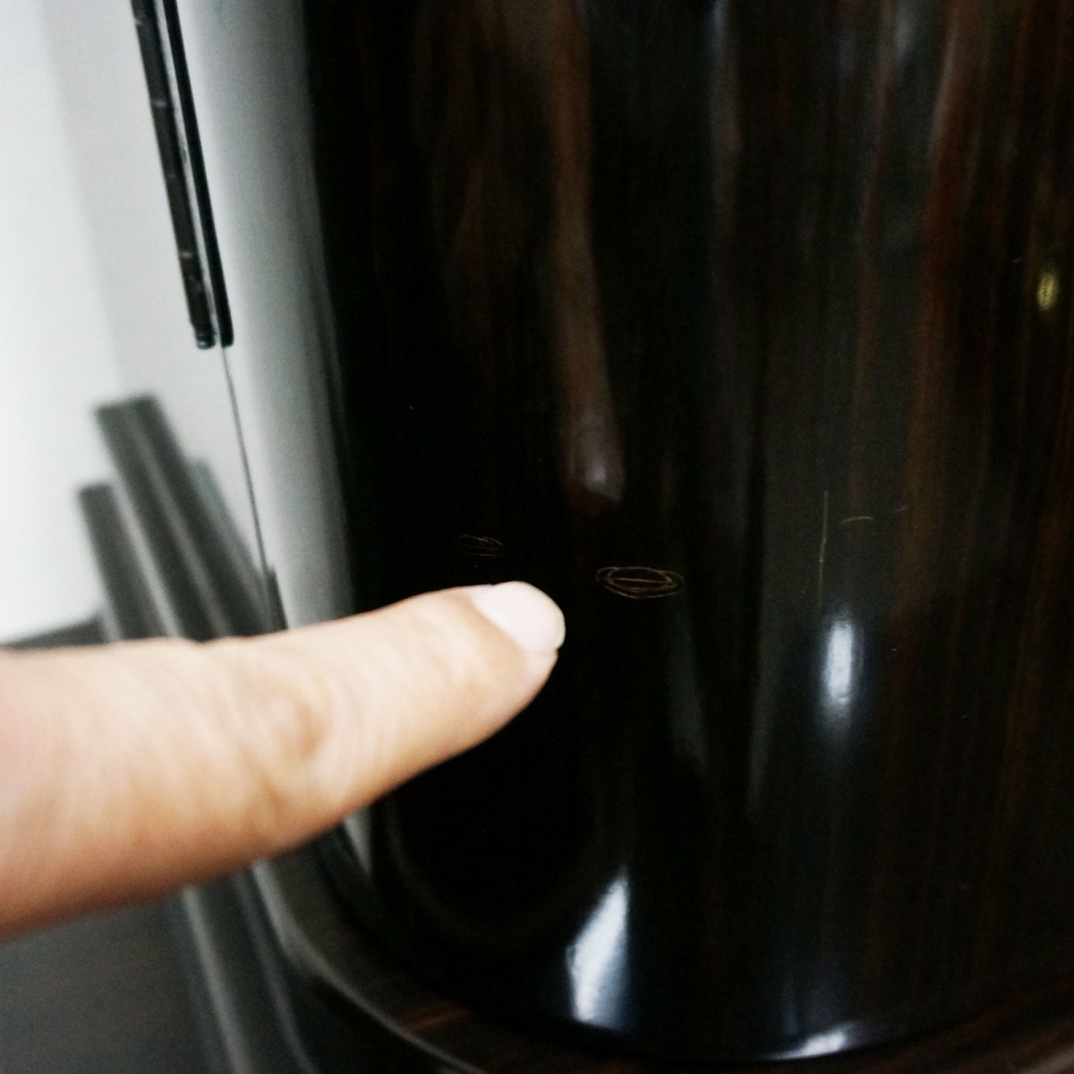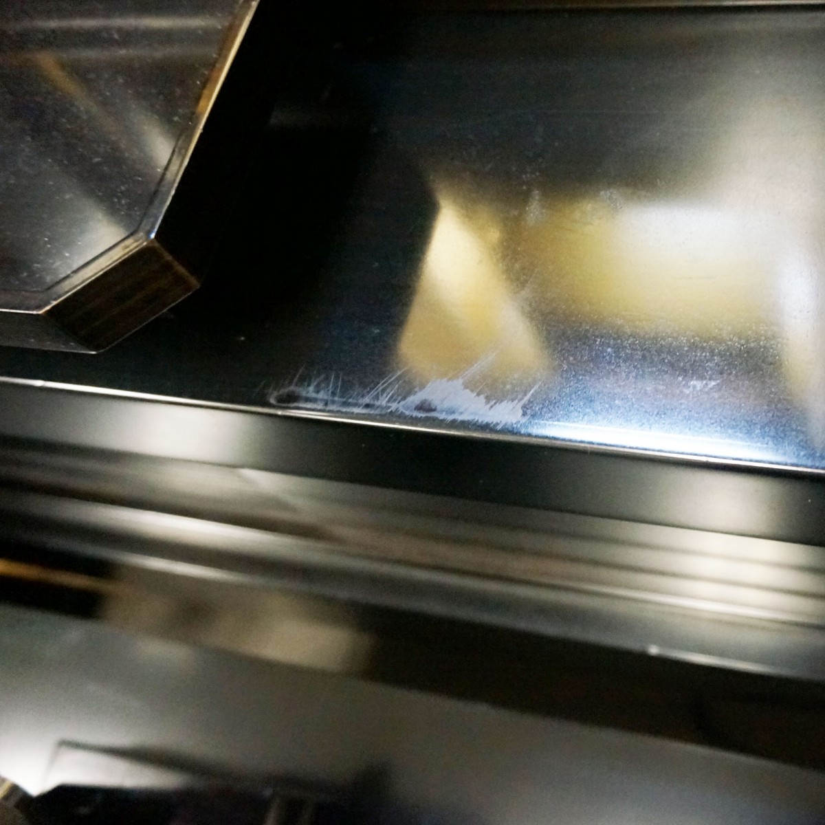 以下、スリキズなどの個所をポイントで示してみました。擦り傷は現状そのままでワックスによりクリーニングいたします。白くなっているポイントは刷毛塗りで黒く塗り直してお届けいたします。
