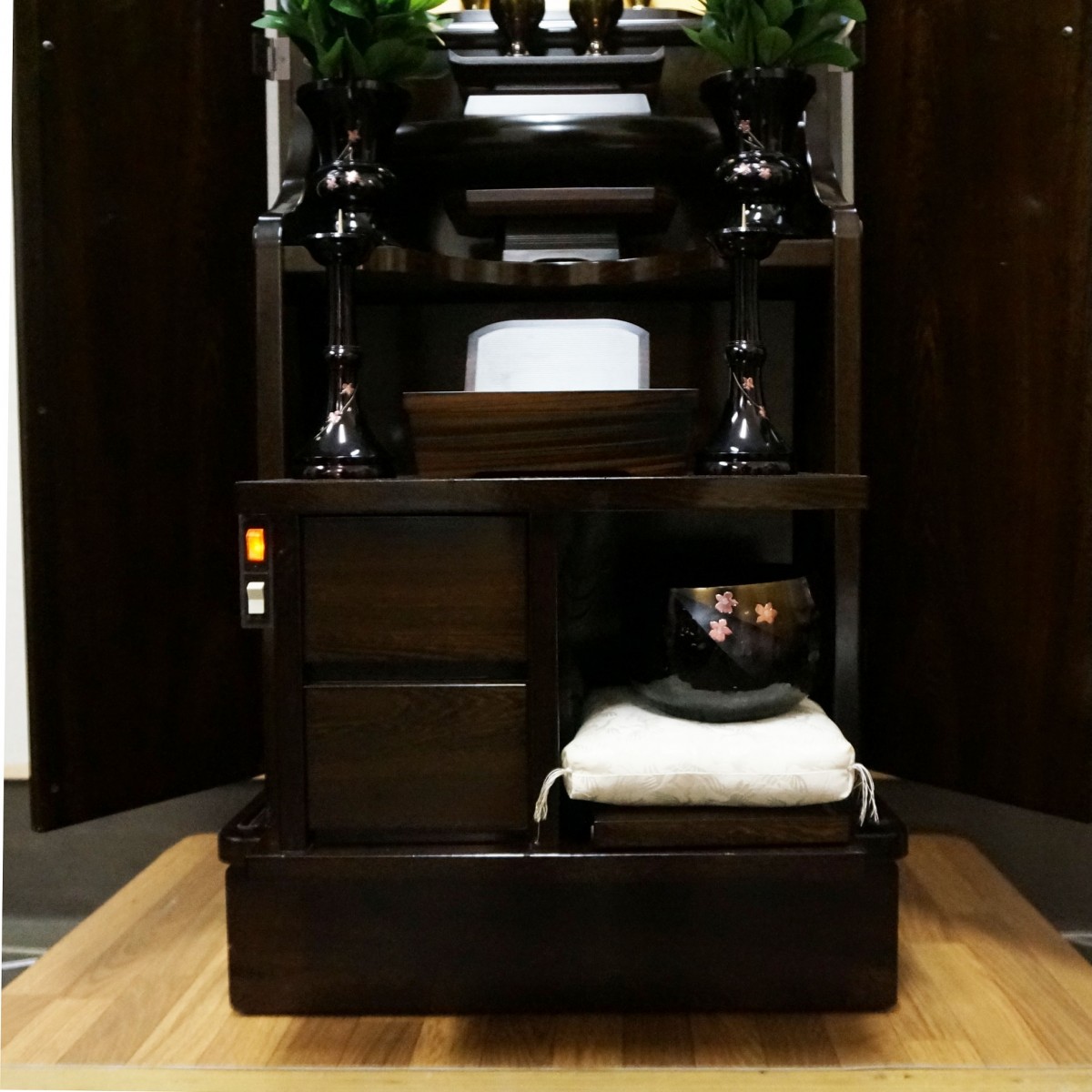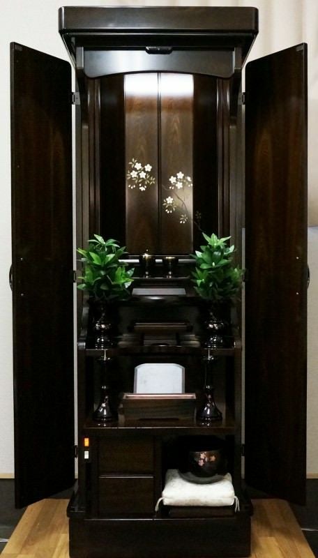 中古家具調仏壇357です。タガヤサンの木目ですっきりした仏壇です。かわいい櫻の花の彫金入り仏具がセットされています。