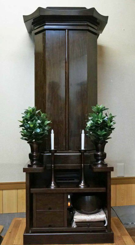 中古家具調仏壇386です。和室・洋室・拠点にも最適なシャム柿のやさしい色合いの仏壇です。 厨子金具が仏壇に品格を醸し出し、落ち着いた心でご本尊様の拝することができる事でしょう