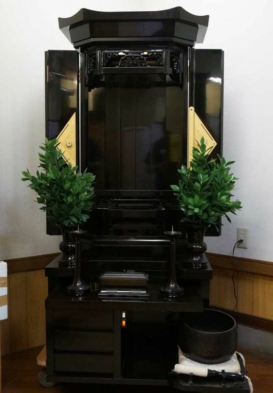 こちらの商品は創価学会厨子型中古仏壇410になります .。黒檀貼りのすっきりした仏壇です