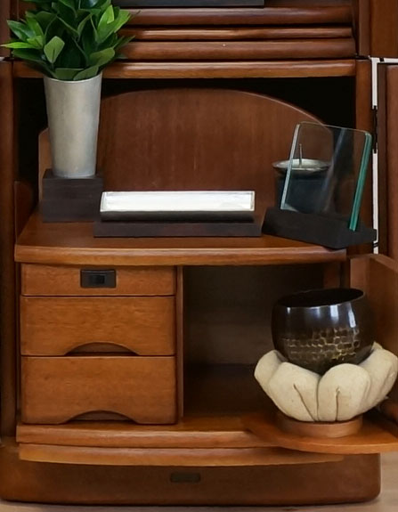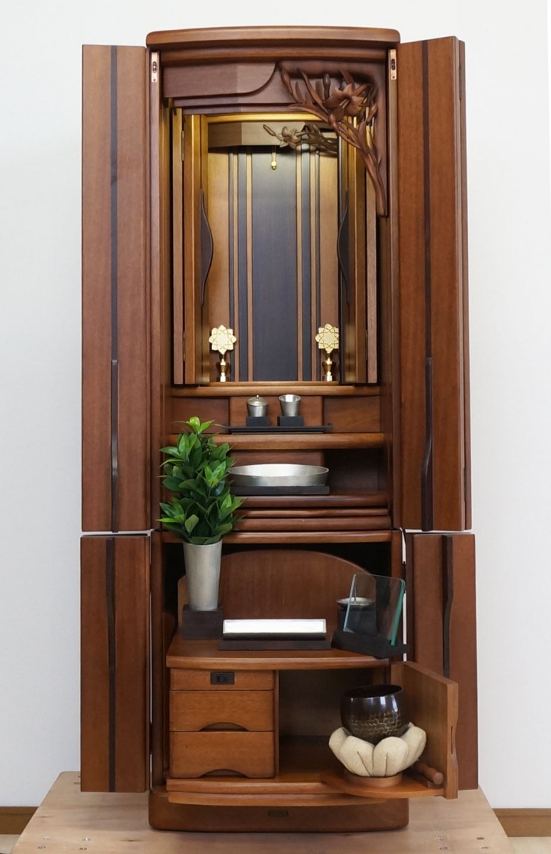 マホガニー色の落ち着いた色合いとゆりの彫刻がとても綺麗な中古家具調仏壇の登場です!