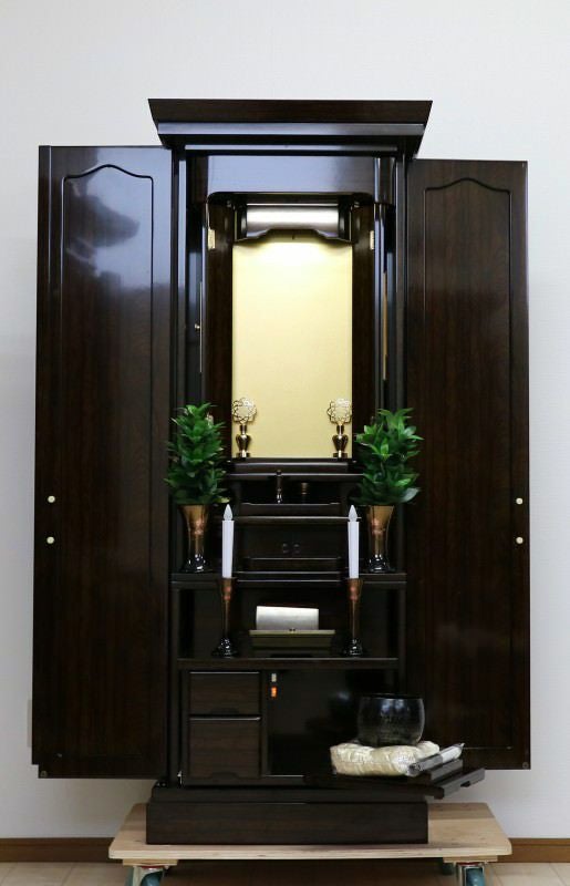 希少価値の高いシャム柿の特徴的な色合いと扉部分に施された素敵な彫刻が目を引く中古家具調仏壇の登場です!