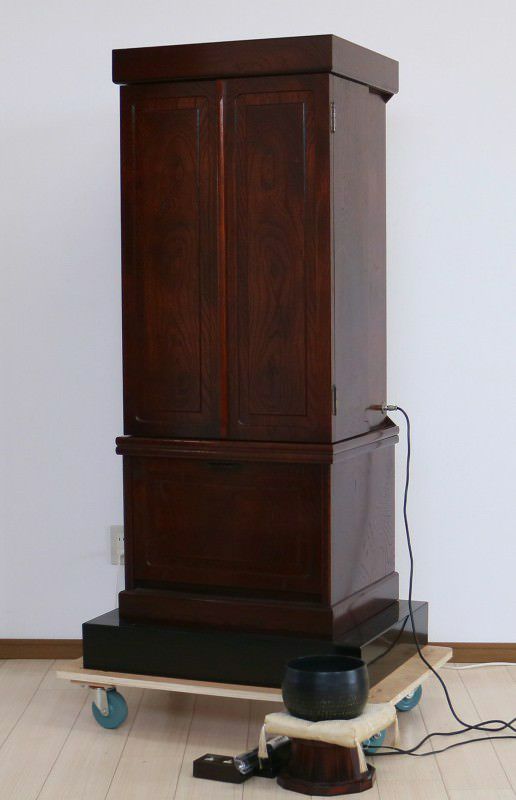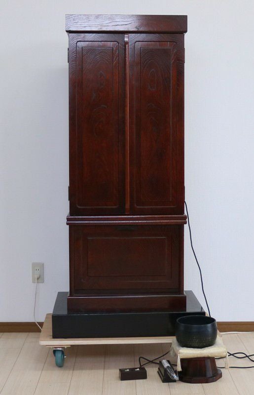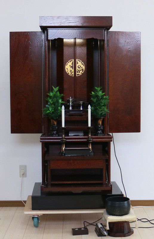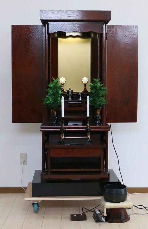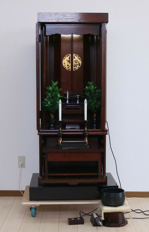 こちらの創価学会家具調仏壇478の特徴は何と言っても本ケヤキの古代色のお仏壇であることです。本ケヤキの古代色は紫檀よりも落ち着きのある色合いで、特徴的な木目が更に温かみを与えてくれる柄になります。お厨子の扉が電動開閉なのはもちろん、弊社にてお厨子の背を特別に新しい金色の板で仕立てさせていただきました。経机の箇所には引き出しもあり、お数珠入れに最適です。引き出しの下には空間もございますので、大百蓮華や御書を置いても宜しいのではないでしょうかまた、仏壇の下にある黒檀の台はご希望の方には何と無料サービスいたします!仏具の花立や灯立は仕入れた際には一部に剥がれがございましたので弊社にて想いを込めて塗装をさせていただきました。には通常小さいおリンがつくのですが、しっかりとした音色が美しいリンとそれに付随して、リン布団やリン棒、リン棒台もお付けいたしますご飯入れ、お水入れ、徳利、リン棒は新品でご用意させていただきました!この私たちの想いも込めた仏具が更に勤行・唱題を深めてくれるお手伝いとなれば幸甚です。