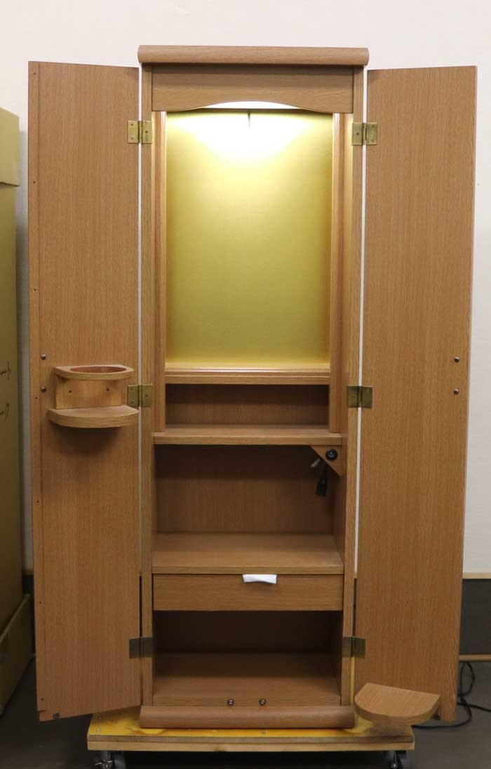 お部屋の設置場所にも困らないシンプルでスリムな家具調仏壇【スマート ライト】です。暖かい木目調の明るい色で、洋室にも和室にもぴったり合います。今回は中古仏壇になります。仏具はすべて新品、蛍光管も新しくいたしました。多少日焼け状態になっていますので気にならない方にお譲りさせて頂きます。