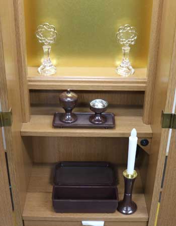また、仏具は3具足(火立て、花立、香炉)になっています ので、仏壇がコンパクトでも仏具のスペースを両扉に設置することにより、しっ かりと勤行、唱題するための空間を確保しているのです。