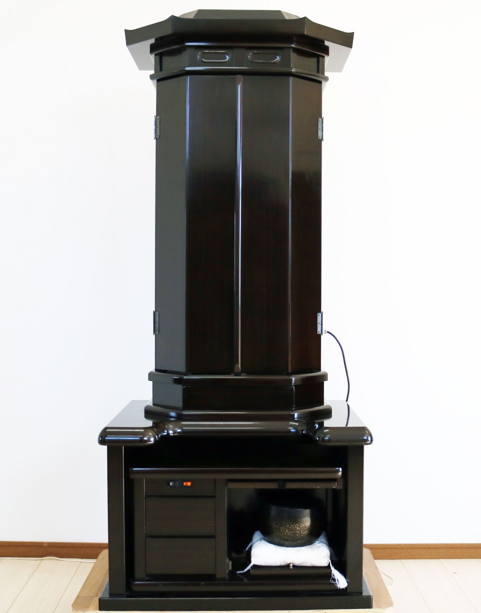 伝統的な六角形の屋根、すっきりとしたお厨子、りんや経机が収納できるフォルム