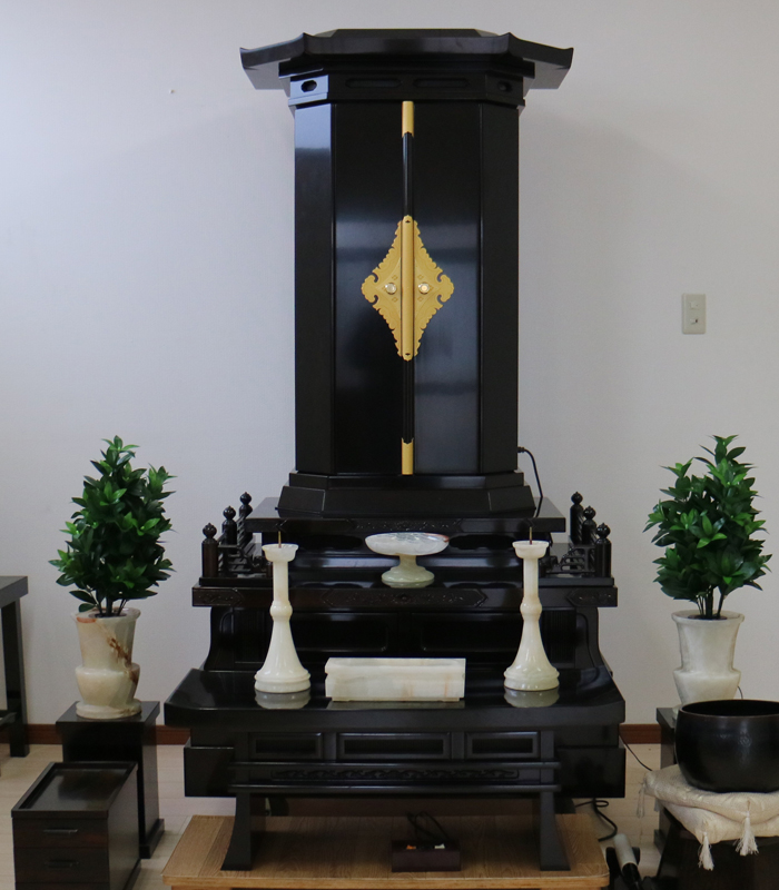 黒柿の厨子型本格厨子型仏壇の登場です! 拠点、会場用の仏壇に最適です。写真の白い仏具は大理石です。仏具の変更もご用意できます。