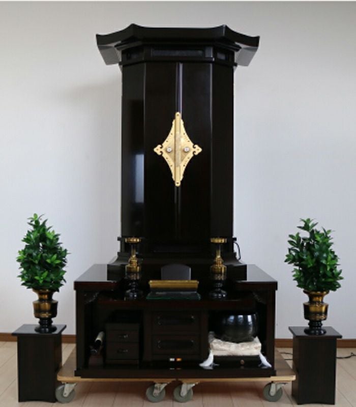 黒檀の厨子型収納仏壇の登場です! 拠点、会場用の仏壇にも最適です。写真の仏具をお付けしての大変お買い得の仏壇です。
