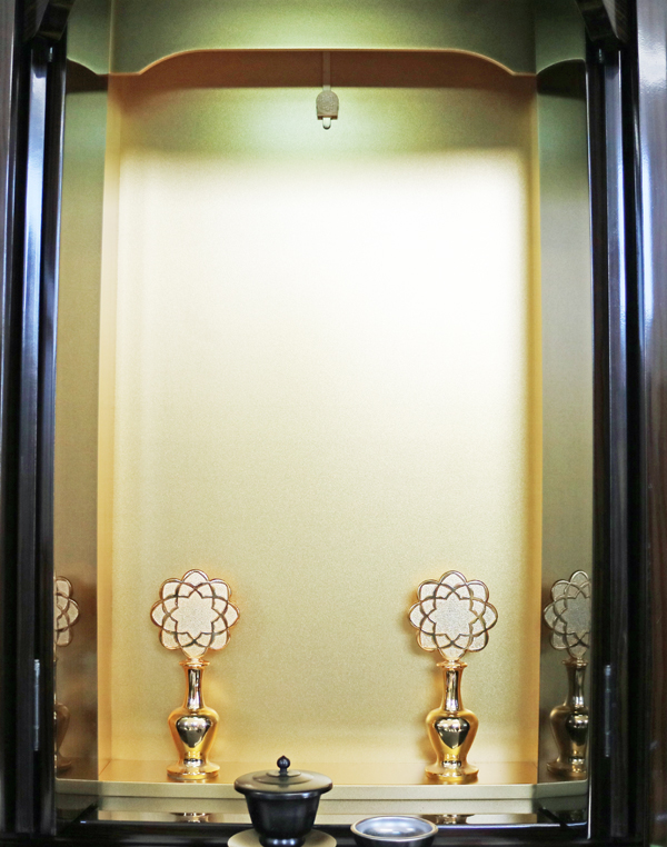 お厨子を開くと金色のお厨子がご本尊様を荘厳してくれます。上部には蛍光灯照明も付属していますのでご本尊様を明るく照らしてくれます。