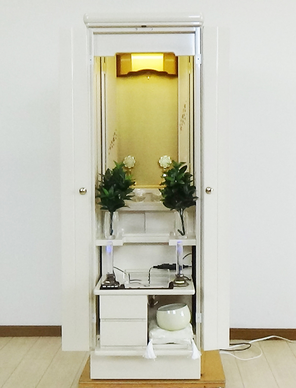 シンプルでコンパクトな家具調仏壇の登場です! ホワイトパール塗装の素敵な品のある清潔感あるとてもきれいな家具著仏壇です。