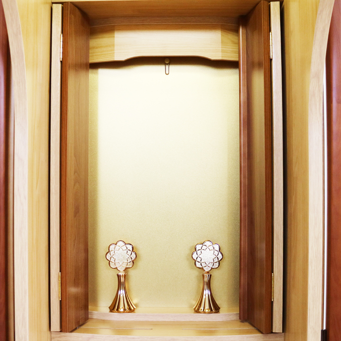 新作のダーク色とライト色のツートンのコンビネーション色です。今までのお仏壇のデザインではなかった、オシャレな雰囲気漂うデザインに仕上がっております。材質はデザインにあった、パイン材を使用しており、暖かみあふれる明るい印象をお部屋にプラスしてくれます。