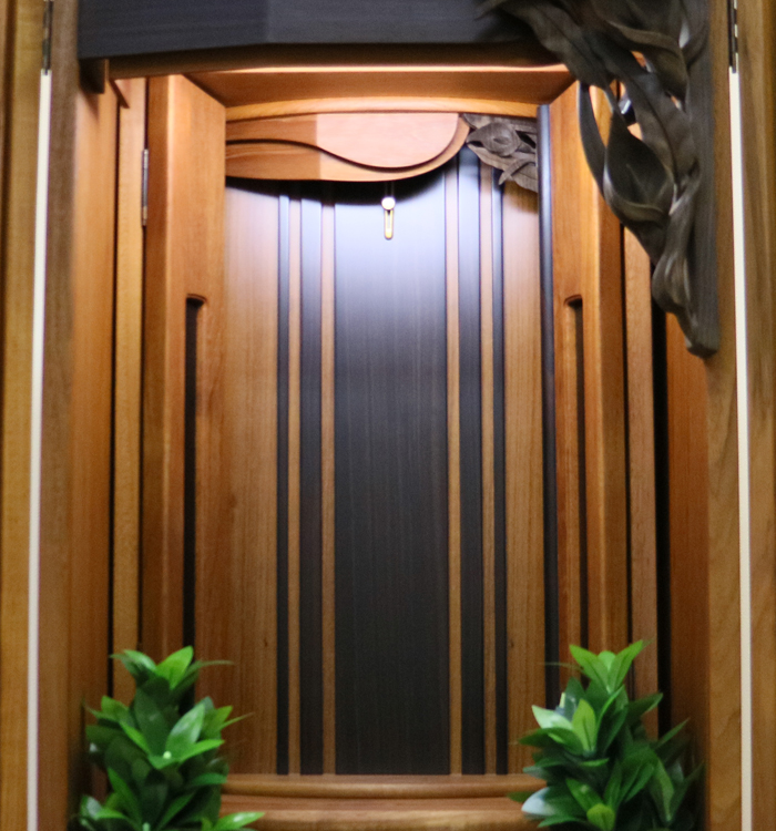 お厨子を開くとチーク材と黒檀のデザイン厨子がご本尊様を荘厳してくれます。