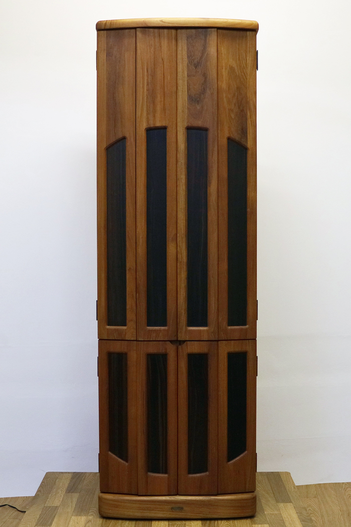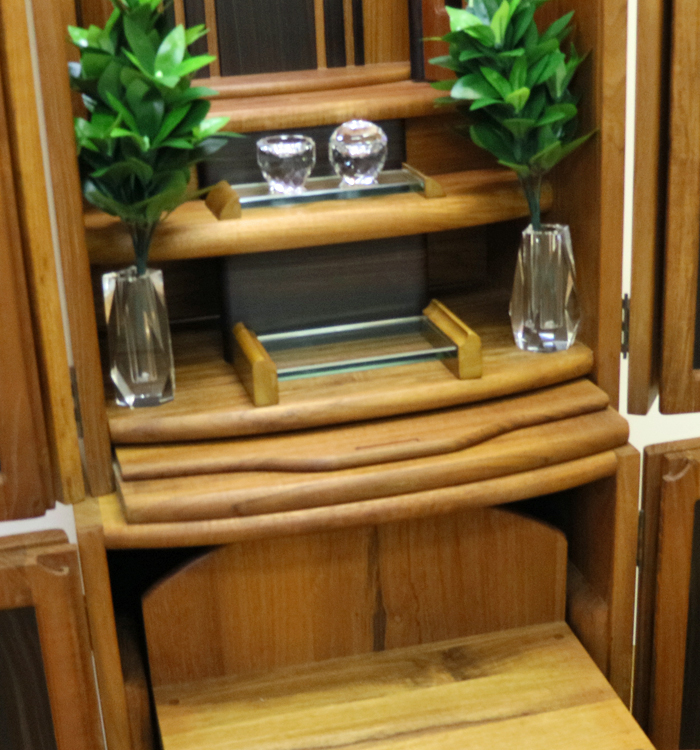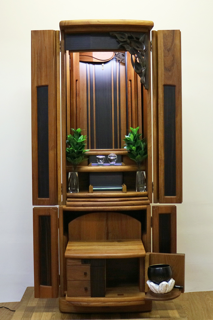 チーク材と黒檀の無垢材をふんだんに使ったこだわりのデザイン家具調仏壇です。本物の木の香り温もりが深い一念を命の底から湧き上がらせる そんなイメージが湧く家具仏壇に仕上がりました。中古仏壇ならではのお手頃価格でご提供致します。