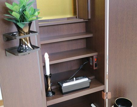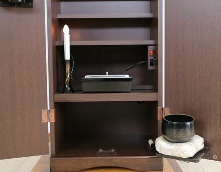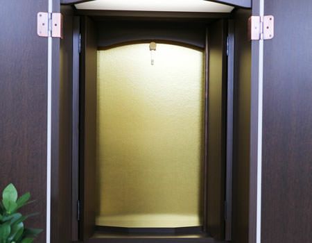お厨子を開くと美しく煌びやかな金色がご本尊様を荘厳してくれます。内部には蛍光灯照明も付属していますのでご本尊様を明るく照らしてくれます。