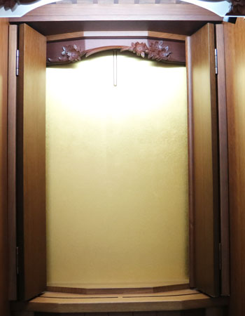 お厨子を開くと美しく煌びやかな金色がご本尊様を荘厳してくれます。内部には蛍光灯照明も付属していますのでご本尊様を明るく照らしてくれます。 また上部には、オシャレな彫刻も!!厨子内にもありますので、二重の彫刻とないrます。