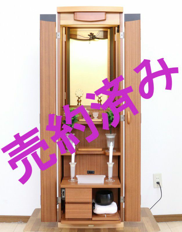 国産のダーク色と、明るいチーク色の木材、ライト色の木材のかわいらしい桜彫刻付き家具調仏壇です。