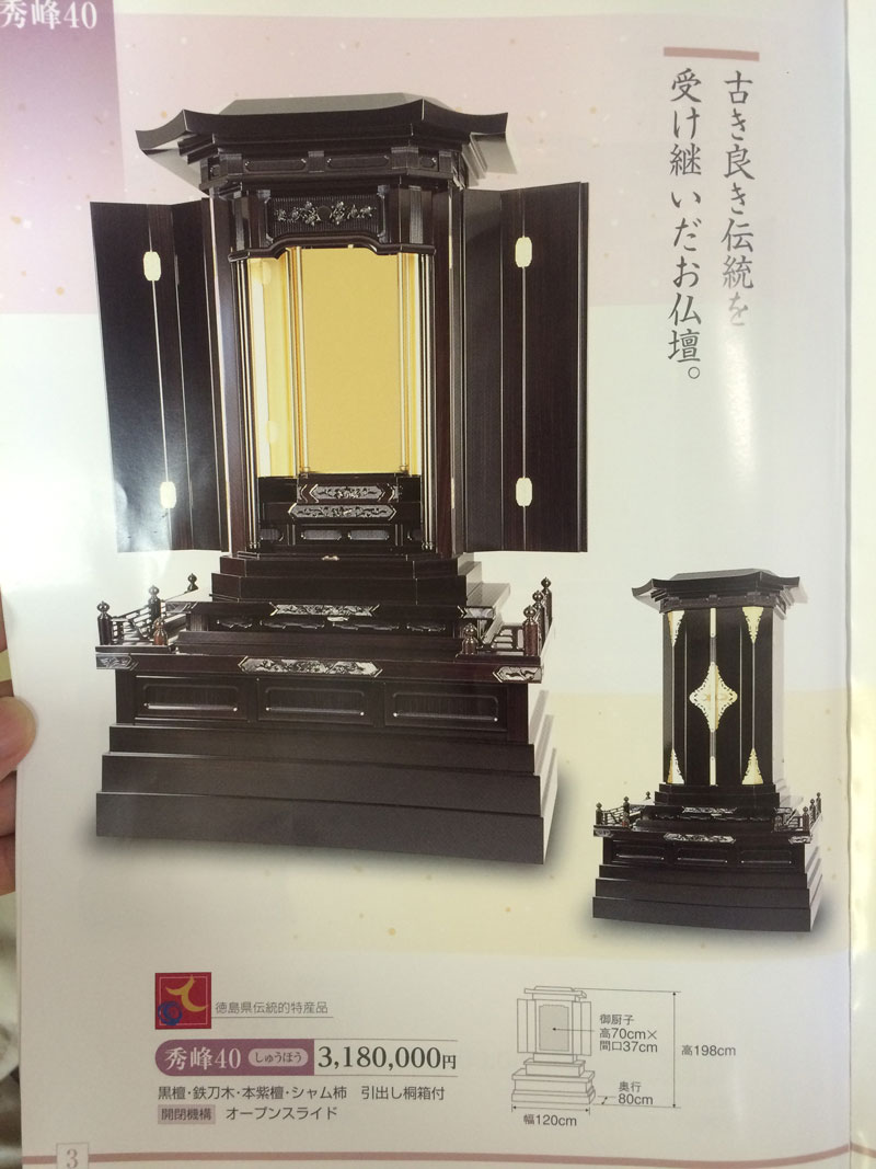 秀峰40という商品で現在も商品販売中です。仏具なし・経机なしの仏壇本のみで定価¥3,180,000-(税別)と同商品です。