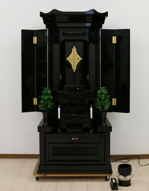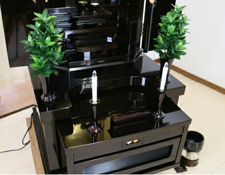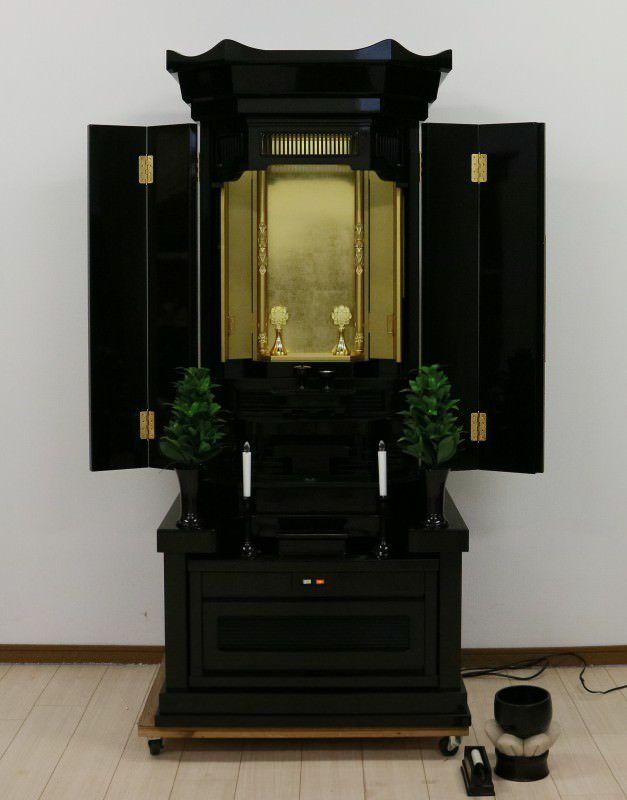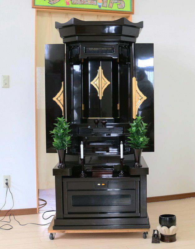 黒檀が、引き締まったかっこよい印象を与えます。個人会館・拠点・和室・床の間に最適です。仏具も新品を多くサービスさせていただいております。