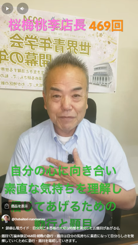題目1万遍体験記469回:朝晩の勤行・題目は自分の気持ちに素直になって自分らしさを発揮していくために勤行・題目を継続していきます。 情熱店長ブログ 2024.08.20 毎日いろいろな事が有ります。人生は変化の連続です。朝勤行していて思う事、本当に自分自身の真実をわかっているのは自分だという事です。自分の気持ちに素直になって自分らしさを発揮していくため、その確認をしたり、生命力を強めるために朝晩の勤行・題目を継続していきます。そのことによって自分で考え、自分で悩みそして自分を信じ、そして自分で解決していくための信心で有り、その軌道が確立していくからこの信心は素晴らしいのだと確信しました。 « 前のブログへ ブログ一覧 次のブログへ »