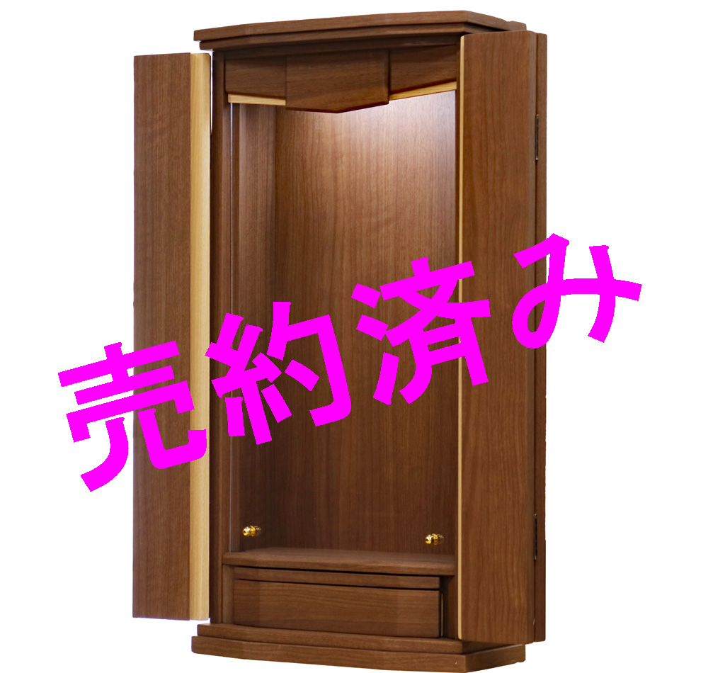 新作コンパクト仏壇です。大戸にマグネットが内蔵しておりますのですっきりとしたデザインに仕上がりました。本物のウォールナット材を使用しているかのような、非常に質感の高い木目調プリントを使用しております。LED照明・アクリル厨子カバー・引き出し・膳引きと機能性に優れたコンパクト仏壇です。