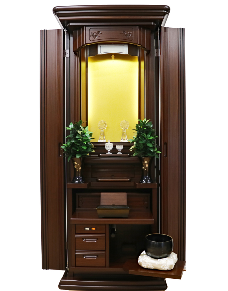 仏壇製造で有名な徳島県産の中古家具調仏壇になります。大戸は押し込み式の大戸を採用しておりますので、押し込むことによって視野が広がり斜めからでもご本尊様を拝すことができます。