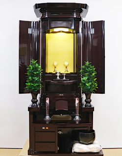 紫檀色の光沢仕上げの高級感あふれるデザインの本格厨子収納型仏壇になります。製造から約10年の商品となります。収納経机等に打ち傷が見られますので格安にてご提供させていただきます。