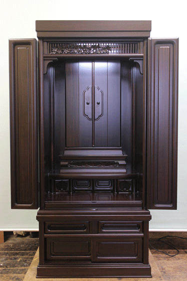 親から受け継いだ創価仏壇、草創期の大変厳しい経済状況から脱却したい、病気がちの日々から境涯革命したいと創価学会に入会して購入から50年になりました。尊敬する親から信心と仏壇を受け継ぎました。デザインをそのままに黒檀で化粧し直し自動開閉にして頂きました。