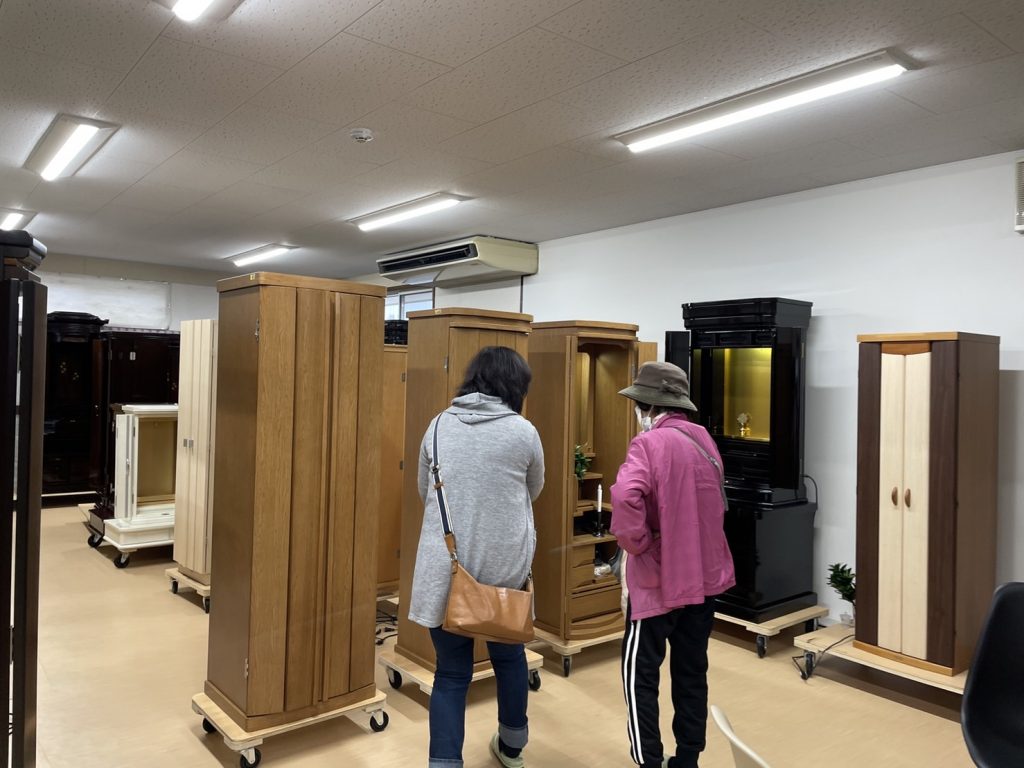 ご希望のお仏壇候補を並べて展示し、イスなどに座ってみて頂いたりして、ご自宅に設置された時をイメージ頂いております。数字のサイズ㎝を見てもなかなか想像しにくいのが仏壇です。できれば実物をご覧いただきましてお決めいただければとご案内させていただいています。今回はお母様のお仏壇を娘さんとご一緒にあれこれお話しながらご検討いただいております。