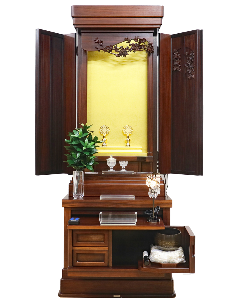 金剛堂さんの15号ソノクリン正三方桜拍子・連戸の中古仏壇です。ソノクリン(紫檀)の無垢板をふんだんに使用して、桜模様の彫りを立体的に仕上げております。電動扉は2段階に調節することができます。お厨子が本金箔仕様となっておりますので、ご本尊様をより荘厳することができます。仏壇製造で有名な徳島県産のお仏壇です。