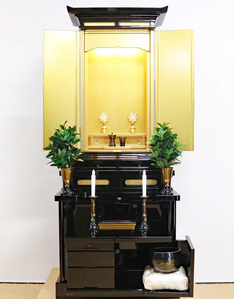漆調黒塗り塗装が施された高級感あふれるデザインのお仏壇です。また、厨子内には金塗装が施されており、黒と金のコントラストが美しい商品になります。蓮台(徳利台)を外しますと特別特装御本尊様を御安置することができます。:上質仕上げ:製造工程・塗装工程で手間をかけて製造したものになります。