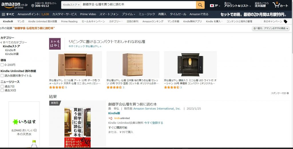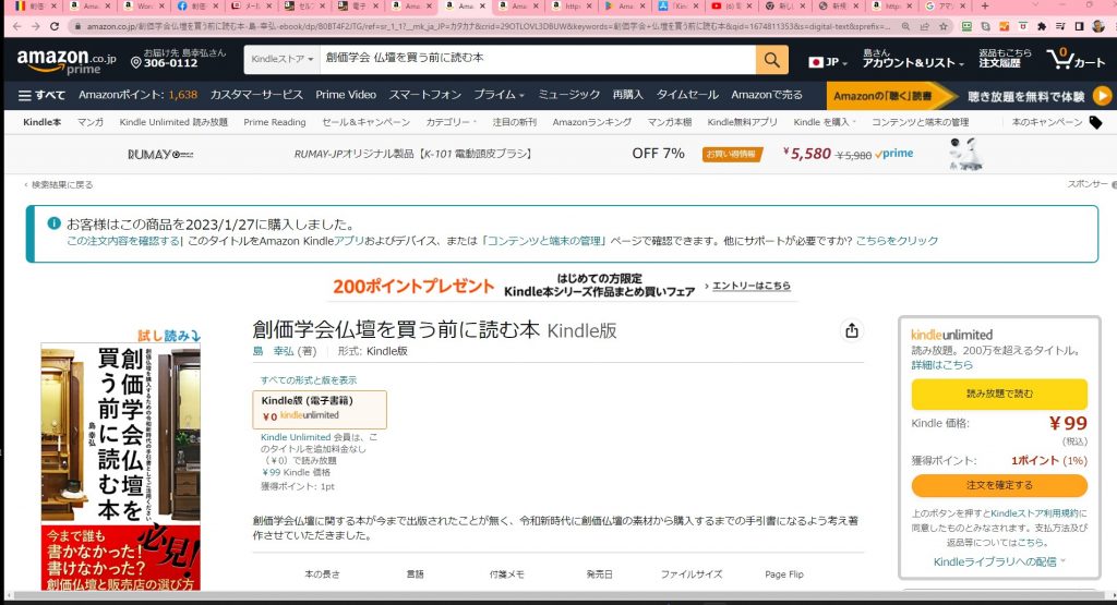Kindle電子出版の購入の仕方:PC版で説明します お知らせ 2023.01.27 ①グーグル検査で「アマゾンKindle」と検索します ②検索窓に「創価学会仏壇を買う前に読む本」と文字を入れます ③本のカバーをクリックすると 注文確定するをクリックして購入してください(1月27日から2月2日まで0円で購入できます) ※購入された後は、kindleに感想・レビューを入れてください!よろしくお願いします。 « 前のブログへ ブログ一覧 次のブログへ »