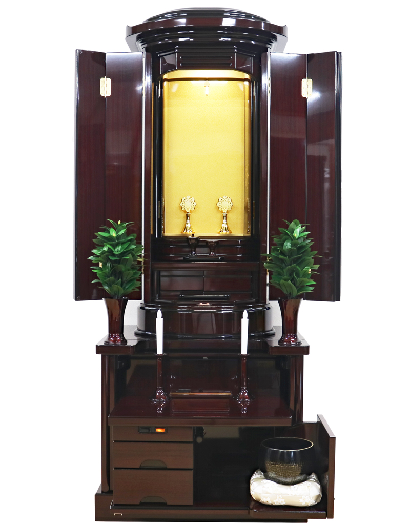 落ち着いた色合い、紫檀の重厚な木目と深み、丁寧な塗装により全体的に光沢のある、高級感あふれるデザインの仏壇に仕上げております。全体的に丸みを帯びているデザインが特徴です。