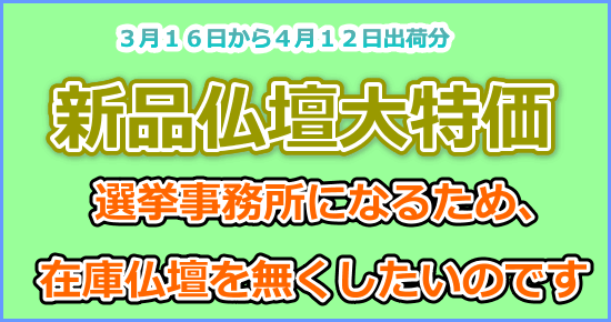 現在の在庫は値上がり前の仏壇になり、以前からのお買い得価格でご提供+現在お使いのお仏壇お引き取り費用を購入サイズと同等まで無料の特典をお付けしております。