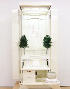 家具調ながら大きくご本尊い包まれるそんな優しい豊かさのある仏壇に仕上がっています。会場拠点用にお勧めできる荘厳で優雅な仏壇「遥・パールホワイト」です。