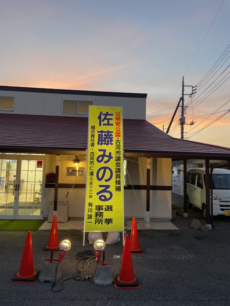 4月19日水曜日も夕方になりました。佐藤 みのる候補は実績多数ございます。市の財政を倹約する街灯のLED化、ネーミングライツ事業で600万の財政を作り上げました。生活支援アプリは私たち市民に使いやすい、わかりやすいアプリと好評です。選挙戦も中盤を越えてまいりました。5期目の挑戦になりました。新たな政策ビジョンも健康から農林、防災、医療、福祉、子育て、教育、安全、雇用、文化まで様々な対策の具体的構想があります。実績もあり今年から4年かけて実現したい政策もある誠実、迅速対応の佐藤 みのるに古河市民の皆様の尊き1票を投票願います。