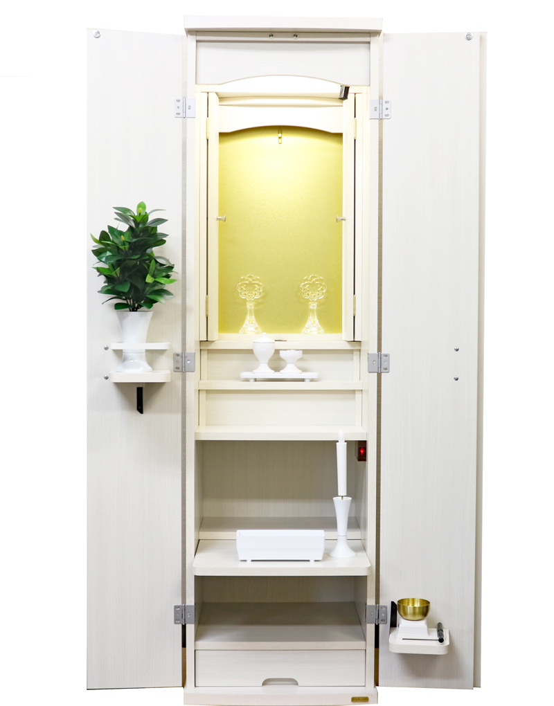 こちらのお仏壇は、金剛堂製のコンパクト家具調厨子手動扉中古仏壇です。木目調のホワイト色でおしゃれなデザインとなっております。お手頃価格ですので、ワンルームや就職・大学進学・お一人暮らしにも最適です。付属仏具は全て新品です。