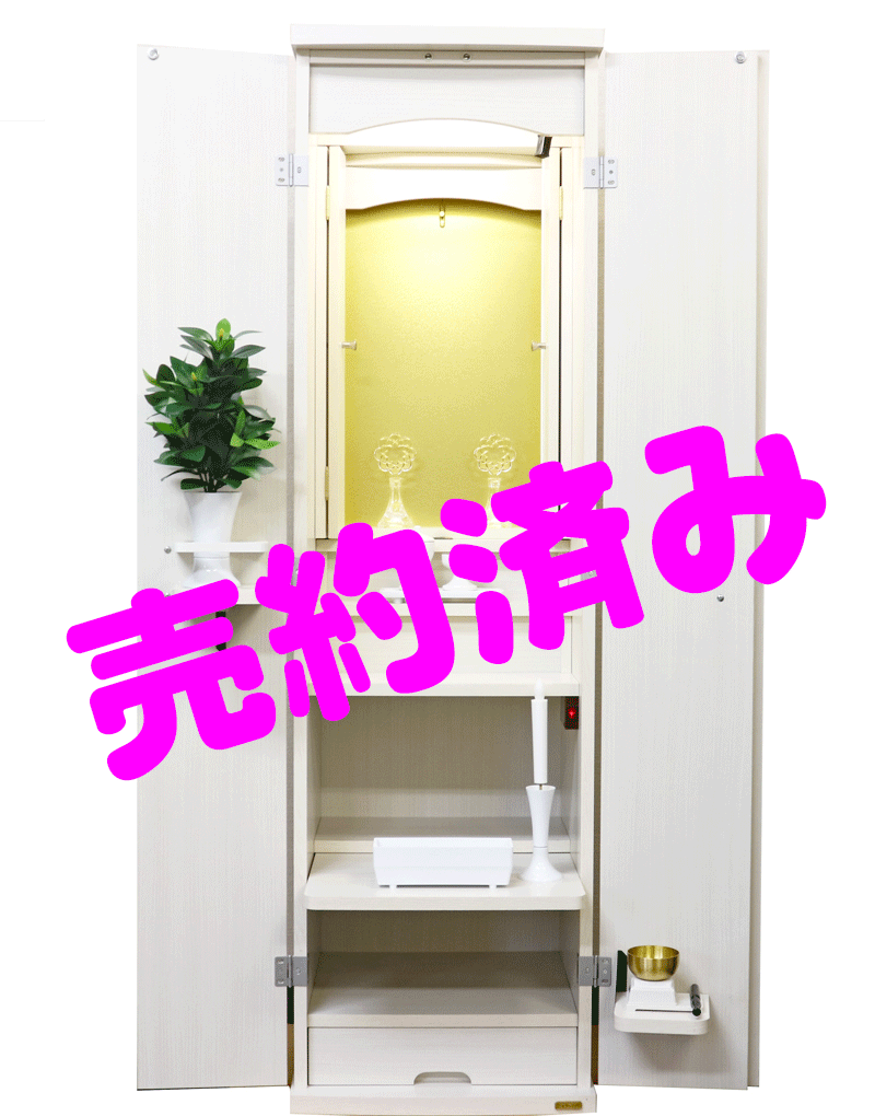 こちらのお仏壇は、金剛堂製のコンパクト家具調厨子手動扉中古仏壇です。木目調のホワイト色でおしゃれなデザインとなっております。お手頃価格ですので、ワンルームや就職・大学進学・お一人暮らしにも最適です。付属仏具は全て新品です。