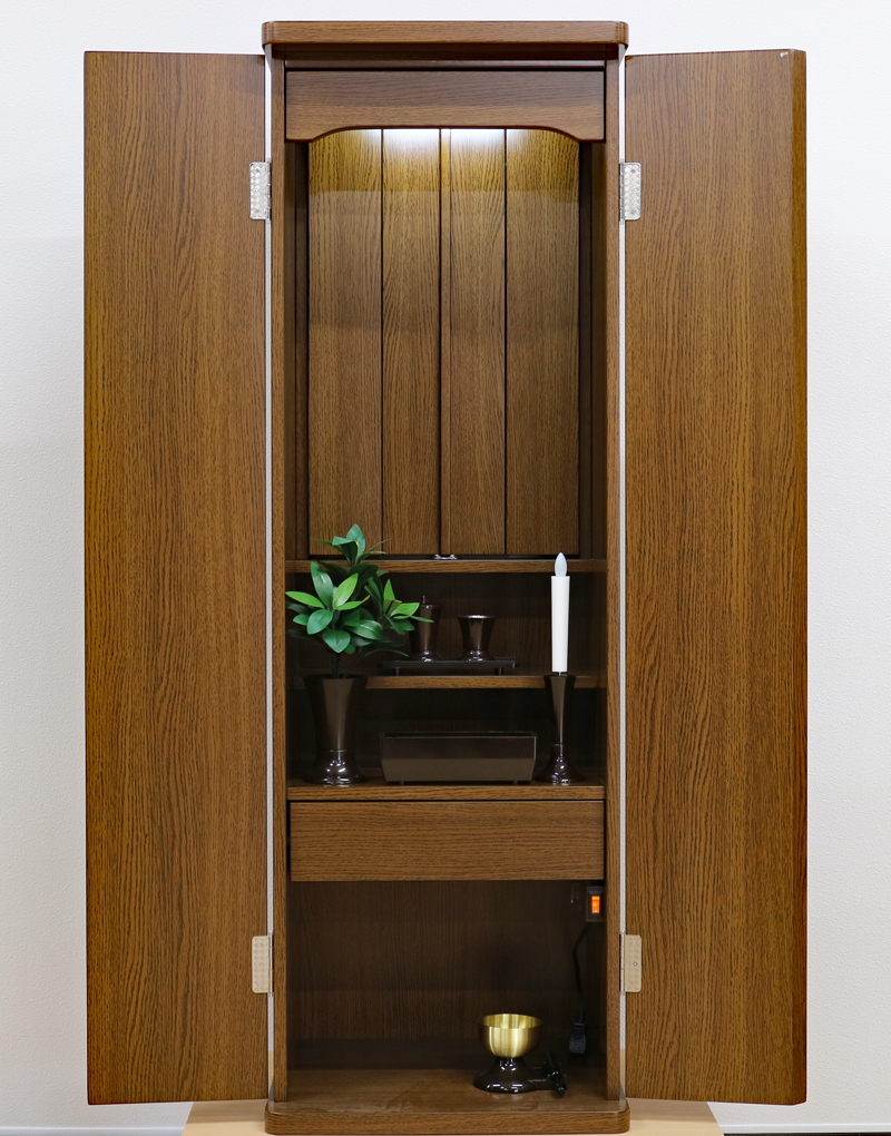 全面ウレタン塗装を施してありますので、傷や水への耐性が強くなり、ちょうど良い光沢があり品質の良い仏壇となりました。お一人様でのワンルーム仕様でも対応できます。とてもコンパクトに設計されていますので、お部屋の模様替え、お引越しなどがあっても、お一人で気軽に移動できます。正座して仏壇前に座れば、ご本尊様の位置も目線的に大丈夫です。
