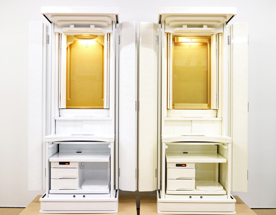 同じデザインですが、全く違う雰囲気になります。以前関西のお客様からのご要望でスーパーホワイト色に当店販売の「茜」をカスタムペインできますか?これまで足かけ5年関西、東京の仏壇店で聞いても「そんなことはできない」と言われていました。この度桜梅桃李.comさんにご縁してお聞きするといとも簡単に「できますよ!」と言われてびっくりしました。