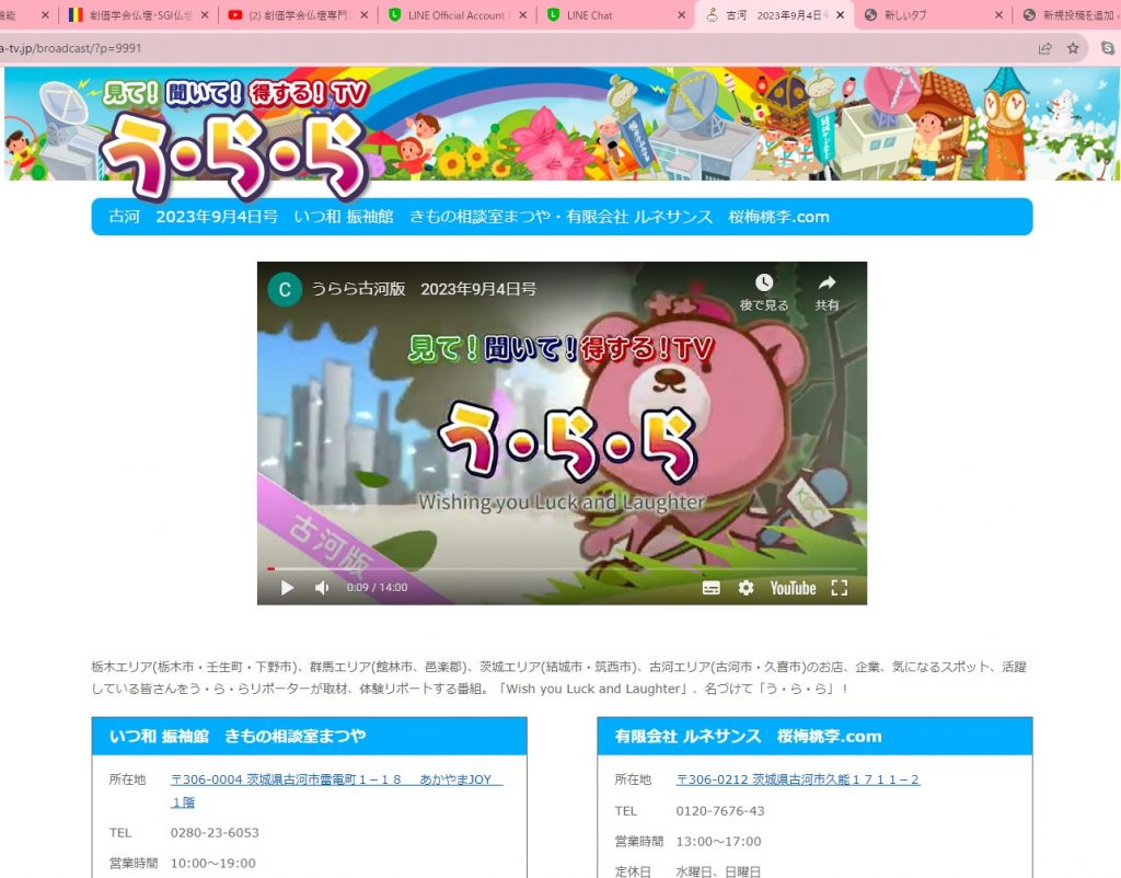 今日から古河ケーブルテレビ:見て!聞いて!得する!TV:う・ら・らで桜梅桃李.comが放映されます。放映時間は、7:30:12:30:17:30:19:30:22:30の5回で9月10日まで毎日放映されます。