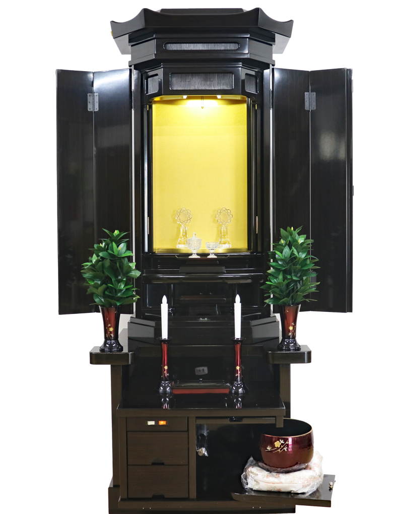 このお仏壇は厨子型収納仏壇の中でデザイン・サイズなどから1番人気の仏壇です。最近ではイスでの勤行・唱題にもご本尊様との目線もちょうど良いと評判もいただいております。現在でも当店にて新品仏具付現金大特価415,000円で販売中の「新創春」の中古仏壇です。