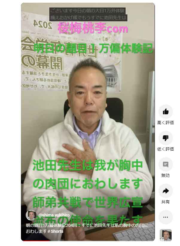 すでに池田先生は私の胸中の肉団におわします。私の生命の中に仏界の中に池田先生がそのままいらっしゃいます。その池田先生の熱き情熱を日々命の中で感じながら私自身の広宣流布の使命と責任を果たしてまいります。今日も自他共の幸福のため精一杯頑張ってい参ります。