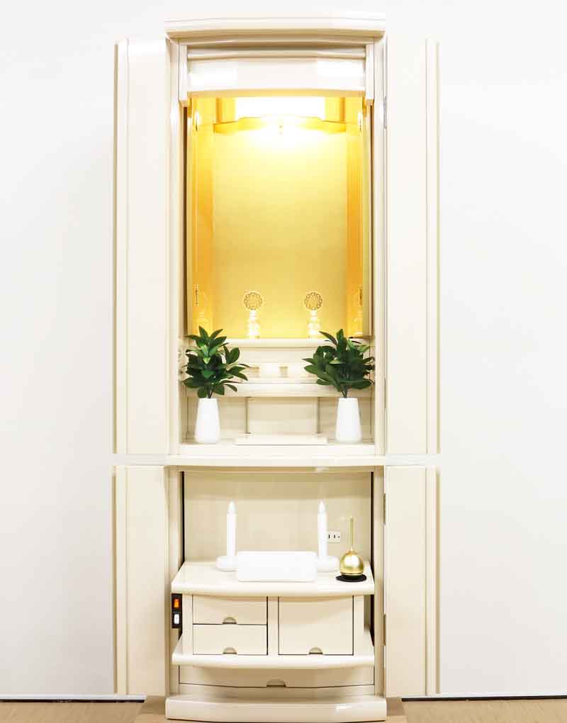 パールホワイト塗装を施した上品なデザインの仏壇です。