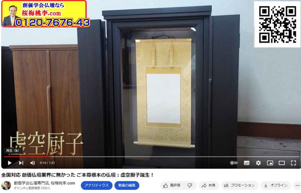 虚空厨子は私が考案しました仏壇です。今までにない!題目をあげるためのお厨子として考案させていただきました。これまでの創価仏壇とは厨子内(ご本尊様の安置するための場所)のデザインを根本的に見直しました。法華経の中の虚空会の儀式の状況をイメージし、そのための演出をデザインとLED照明を使って表現させていただきました。