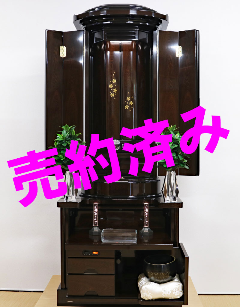 タガヤサンの重厚な木目と深み、丁寧な塗装により全体的に光沢のある、高級感あふれるデザインの仏壇に仕上げております。厨子扉には、静岡県に伝わる伝統技法「駿河蒔絵」で風に舞う綺麗な流れ桜の蒔絵が施されております。全体的に丸みを帯びているデザインが特徴です。