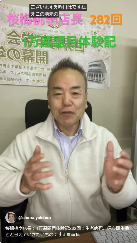 桜梅桃李店長:1万遍題目体験記282回:生老病死、信心即生活ととらえていきたいものです 情熱店長ブログ 2024.02.13 昨日は地元のずっと男子部から一緒に来ました現役の支部長さん訪問頂きました。 同じ年齢ですので生老病死の話になりました。お互い最近疲れるね!とうなずき合いながら生老病死の老と病と死ここが長いよね。 この部分をどう生きていくのか?信心即生活ととらえていきたいものだよね!と言う事で人生の生き方は信心即生活と意識しないとね!との結論になりました。 « 前のブログへ ブログ一覧 次のブログへ »