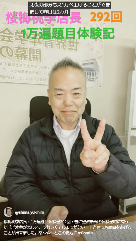 桜梅桃李店長:1万遍題目体験記292回:昔に聖教新聞の体験記時に有った「ご本尊が恋しい、うれしくてしょうがない!」と言うお題目をあげることが出来ました。あ~やっとこの境地に 情熱店長ブログ 2024.02.23 雪交じりの雨、ご安全に!方便品・自我偈講義も今回で2度目読了しました。一回目では分からなかった、感じ取れなかった箇所も命にスッと入ってきました。 感動して夜も1万遍追加し本日は2万遍の題目になりました。 昔に聖教新聞の体験記時に有った「ご本尊が恋しい、うれしくてしょうがない!」と言うお題目をあげることが出来ました。あ~やっとこの境地に達せられたようです。感謝です « 前のブログへ ブログ一覧 次のブログへ »